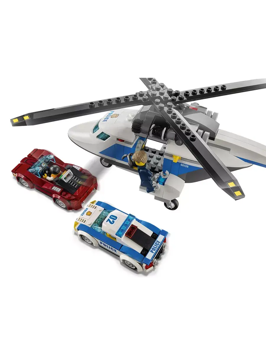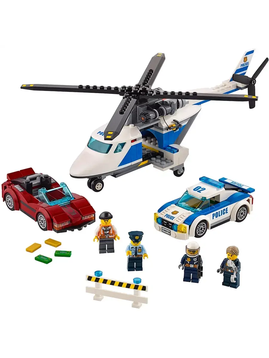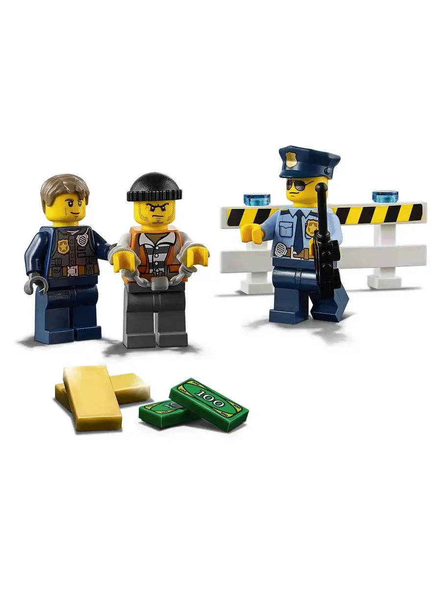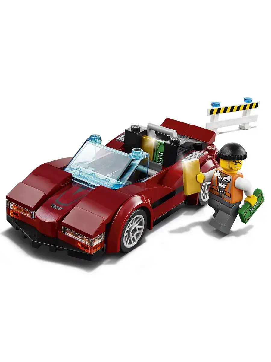 Тревога, тревога! Вор украл деньги и золотые слитки и бросился наутек! Срочно догони его вместе с отважными полицейскими. Садись в полицейскую машину, включай сирены на крыше, и мчись вдогонку за красным автомобилем. Или запрыгивай в вертолет, взлетай ввысь и догони преступника. А как будешь над ним – на лебедке спускайся в авто и запрыгивай в салон. Надень наручники на беглеца, прежде чем он покинет город. Как думаешь, удастся ли тебе это сделать? Особенности набора: · Вертолет с вместительным салоном для пассажиров, тремя колесами, вращающимися винтами на крыше и хвосте; · Лебедка с крюком на барабане, закрепленном на вертолете; · Полицейский автомобиль с сиреной сверху и задним спойлером; · Красный автомобиль преступника с открытым салоном; · Аксессуары: заграждения, деньги и слитки, наручники, головные уборы; 4 мини фигурки: пилот, 2 полицейских и преступник.
