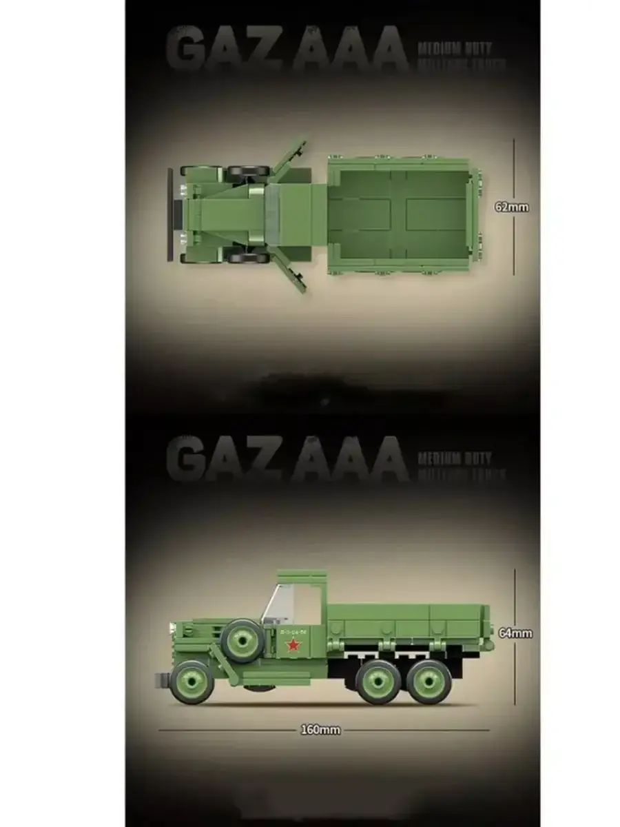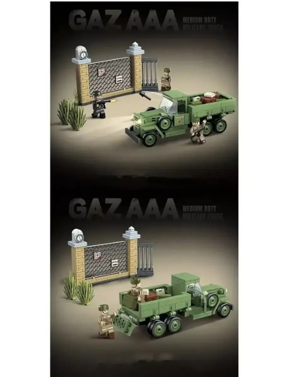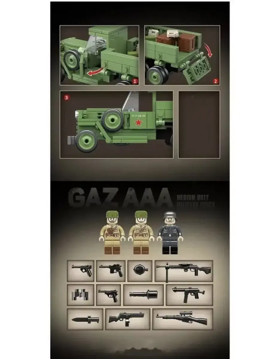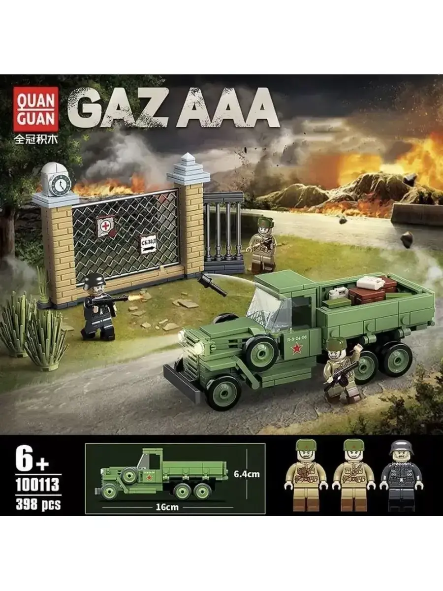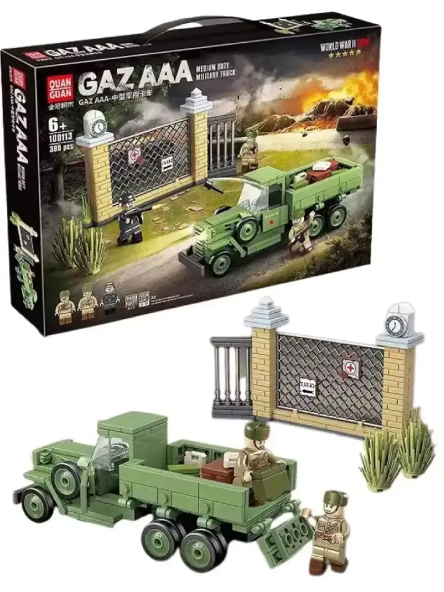 Конструктор Quan Guan "Военный грузовик ГАЗ ААА" состоит из 398 деталей. Набор представляет собой модель советского грузовика средней грузоподъемности. Данный автомобиль использовался во время второй мировой войны и применялся для перевозки людей и различных боеприпасов. В комплект конструктора входят - военный грузовик, ворота, 3 мини фигурки солдат и дополнительные аксессуары в виде оружия. С этим набором ребенок сможет в полной мере проявить фантазию и реализовать множество сюжетов военного времени! Играйте и получайте пользу! В процессе игры у детей развивается воображение, навыки конструирования, мышление и мелкая моторика.