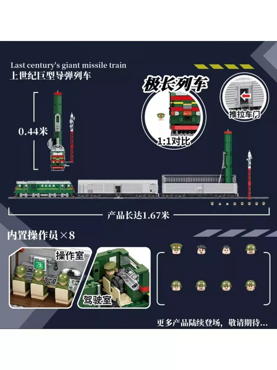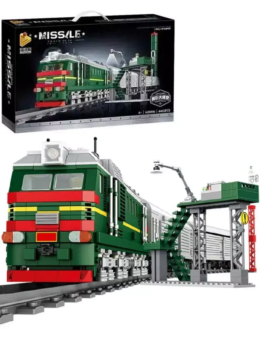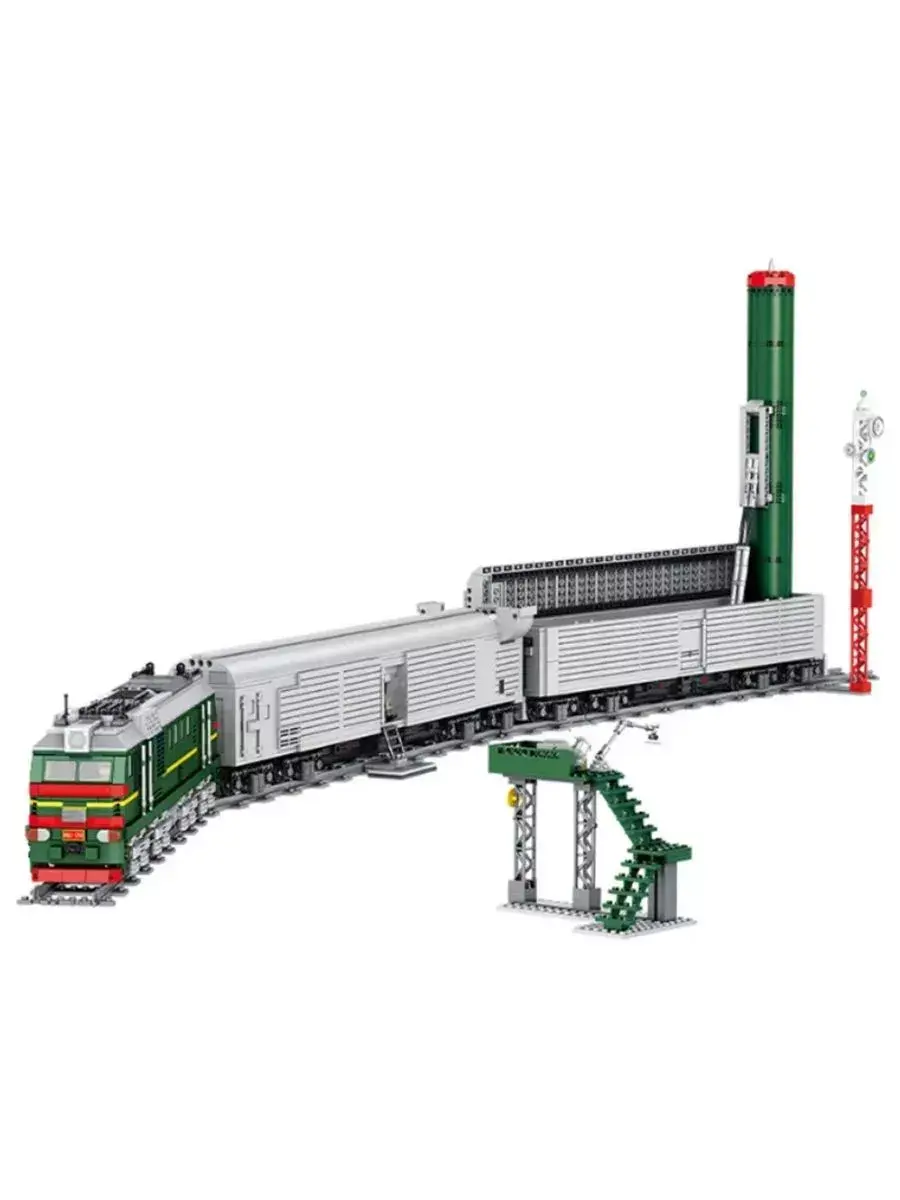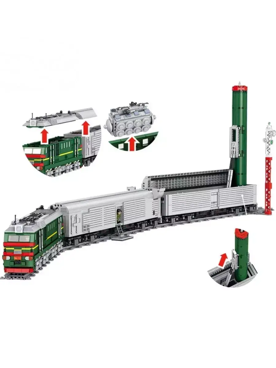 Конструктор из серии Военная техника Военный ракетный поезд состоит из 4410 деталей. Из деталей набора можно собрать специально сконструированный железнодорожный состав, в вагонах которого размещаются межконтинентальные ракеты, а также командные пункты, технологические и технические системы, средства охраны, личный состав, обеспечивающий эксплуатацию комплекса и системы его жизнеобеспечения. В комплекте 8 минифигурок солдат и офицеров, обслуживающих комплекс. Крыши вагонов можно снять и рассмотреть подробно все внутри. Ракету можно установить на старт или опустить для перевозки.