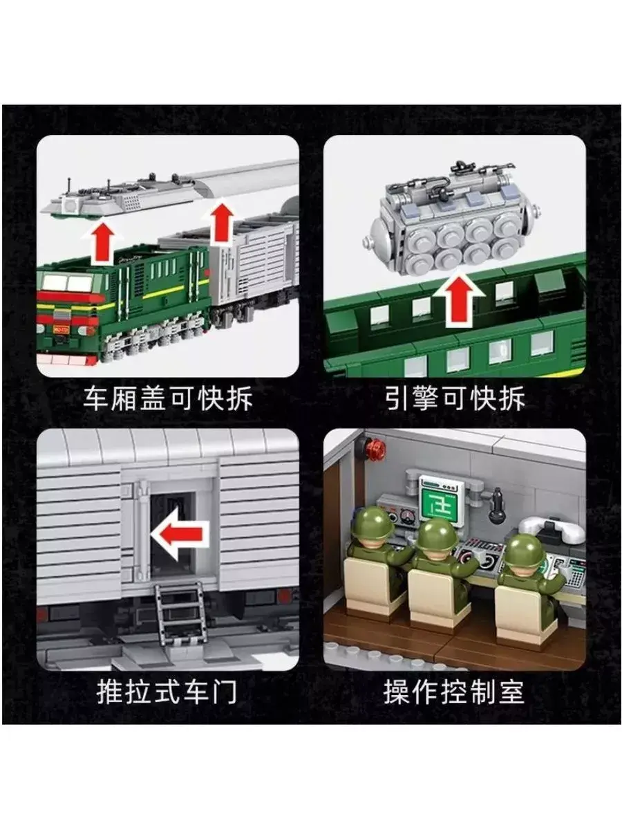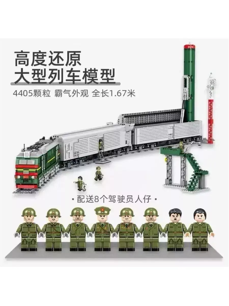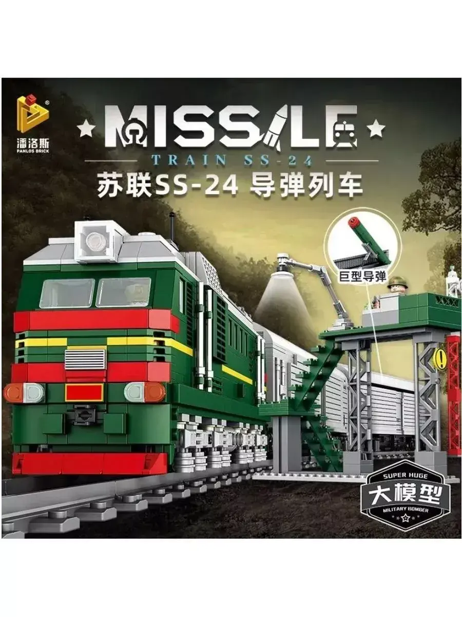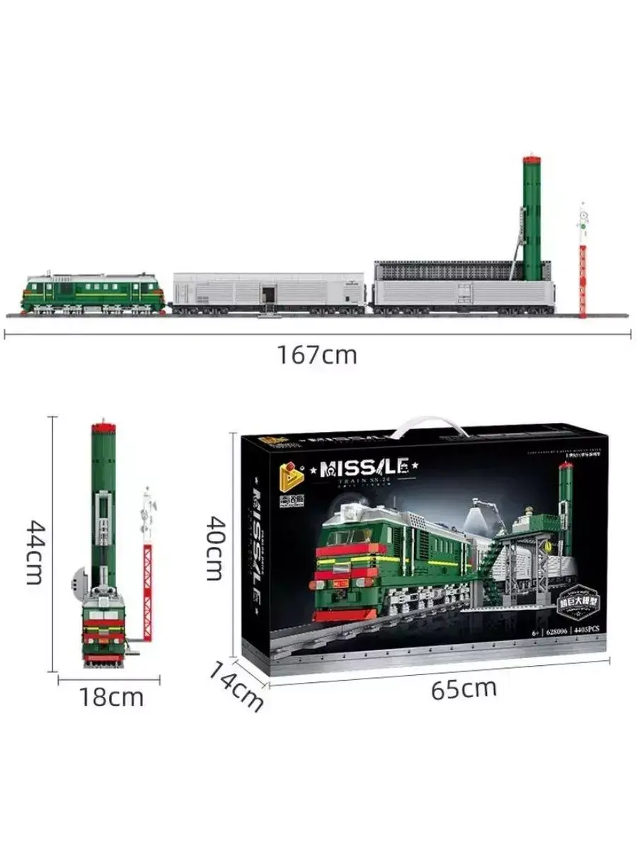 Конструктор из серии Военная техника Военный ракетный поезд состоит из 4410 деталей. Из деталей набора можно собрать специально сконструированный железнодорожный состав, в вагонах которого размещаются межконтинентальные ракеты, а также командные пункты, технологические и технические системы, средства охраны, личный состав, обеспечивающий эксплуатацию комплекса и системы его жизнеобеспечения. В комплекте 8 минифигурок солдат и офицеров, обслуживающих комплекс. Крыши вагонов можно снять и рассмотреть подробно все внутри. Ракету можно установить на старт или опустить для перевозки.