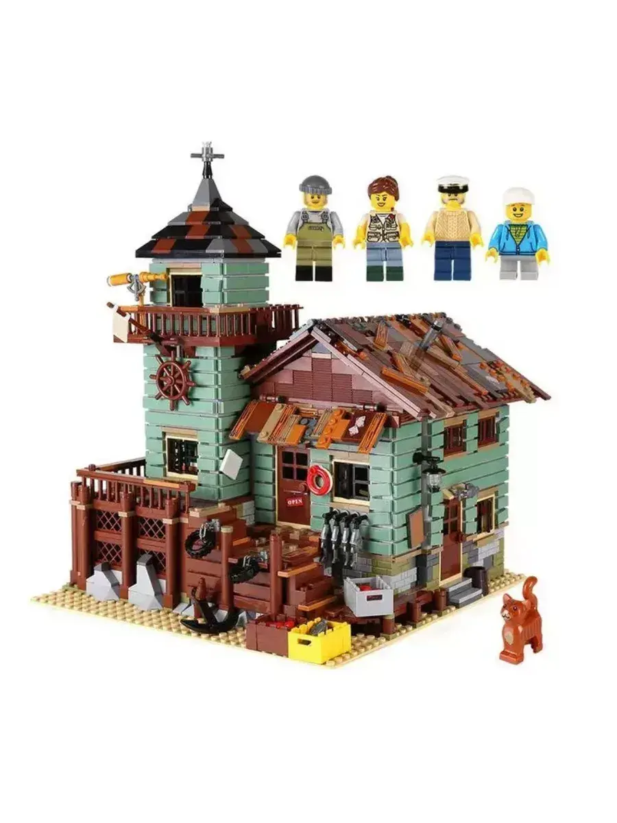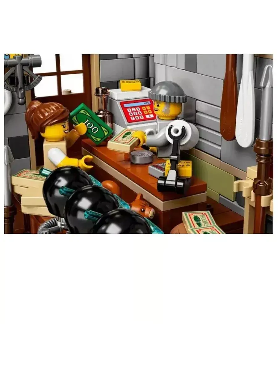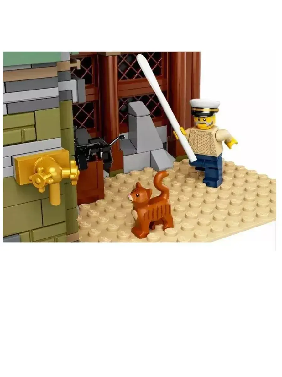 Один из самых объемных, уникальных и потрясающих конструкторов с огромным количеством тематических аксессуаров. Крышу магазина можно снять и рассмотреть интерьер. А, если захочется исследовать каждый уголок помещения, достаточно будет открыть заднюю стену-дверь. В комплекте 4 человечка. В набор входят минифигурки персонажей: Капитан в фуражке с кружкой, рыбак с удочкой, рыбачка с рыбой, ребенок в жилете с кошкой.