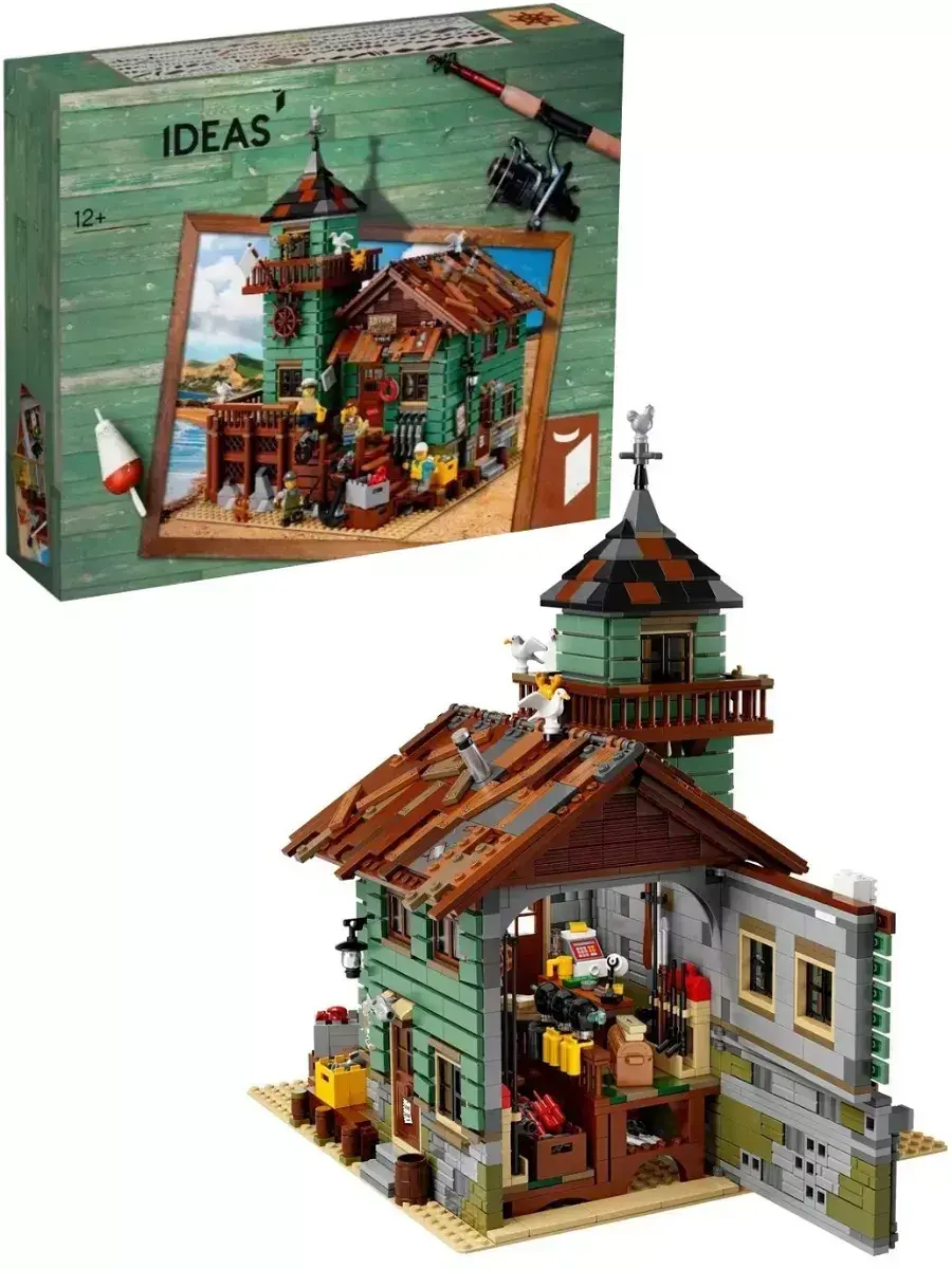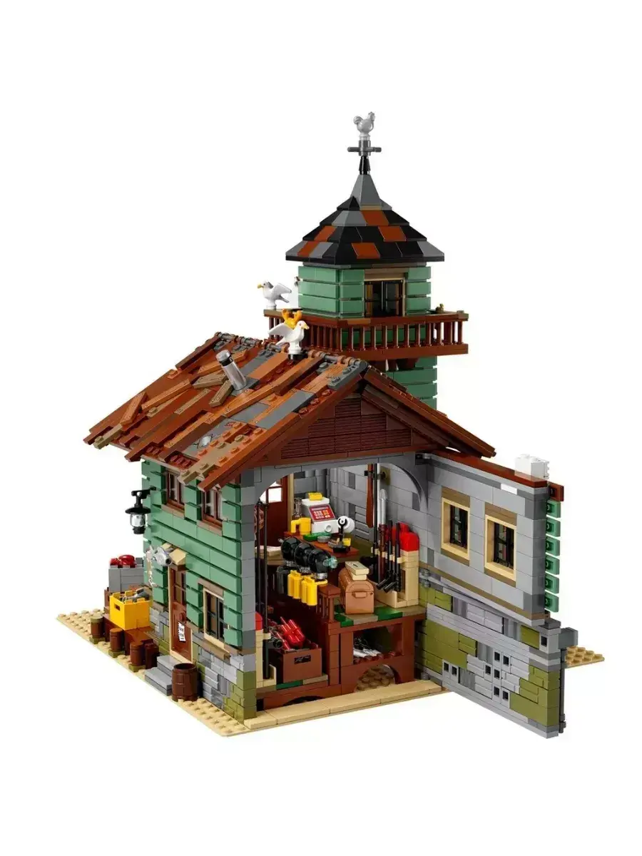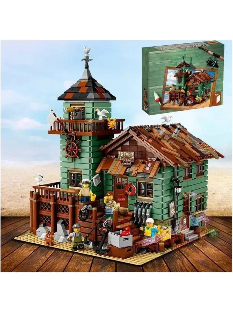 Один из самых объемных, уникальных и потрясающих конструкторов с огромным количеством тематических аксессуаров. Крышу магазина можно снять и рассмотреть интерьер. А, если захочется исследовать каждый уголок помещения, достаточно будет открыть заднюю стену-дверь. В комплекте 4 человечка. В набор входят минифигурки персонажей: Капитан в фуражке с кружкой, рыбак с удочкой, рыбачка с рыбой, ребенок в жилете с кошкой.