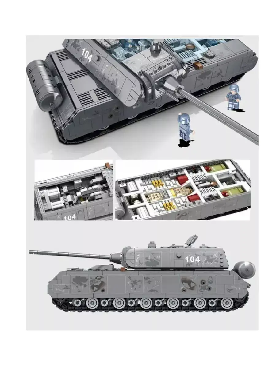 Сверхтяжёлый танк, спроектированный в Третьем рейхе в период с 1942 по 1945 годы под руководством Фердинанда Порше. Является самым крупным по массе танком из всех, когда-либо воплощённых в металле. Было построено всего два экземпляра машины. В боевых действиях не участвовал. На сегодняшний день в мире сохранился только один танк «Маус», собранный из частей обоих экземпляров, в Техническом центре в парке «Патриот» Сборка конструктора не только увлечет вашего ребенка на долгое время, но и поможет развитию мелкой моторики детских рук, внимания к деталям, а также пространственного мышления. Кроме того, в процессе сборки модели ребенок познакомится с историей и особенностями данного танка. А готовая модель станет прекрасным украшением интерьера детской комнаты или рабочего стола, вызывая гордость у своего обладателя. В комплект набора входят 5 минифигурок, что позволяет разнообразить игровые сценарии и добавляет модели еще больше реалистичности.