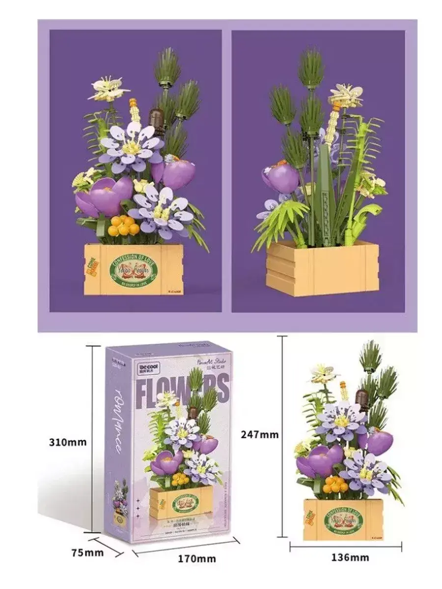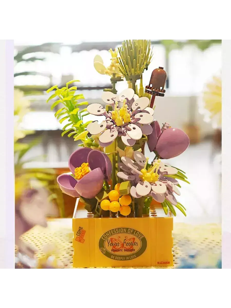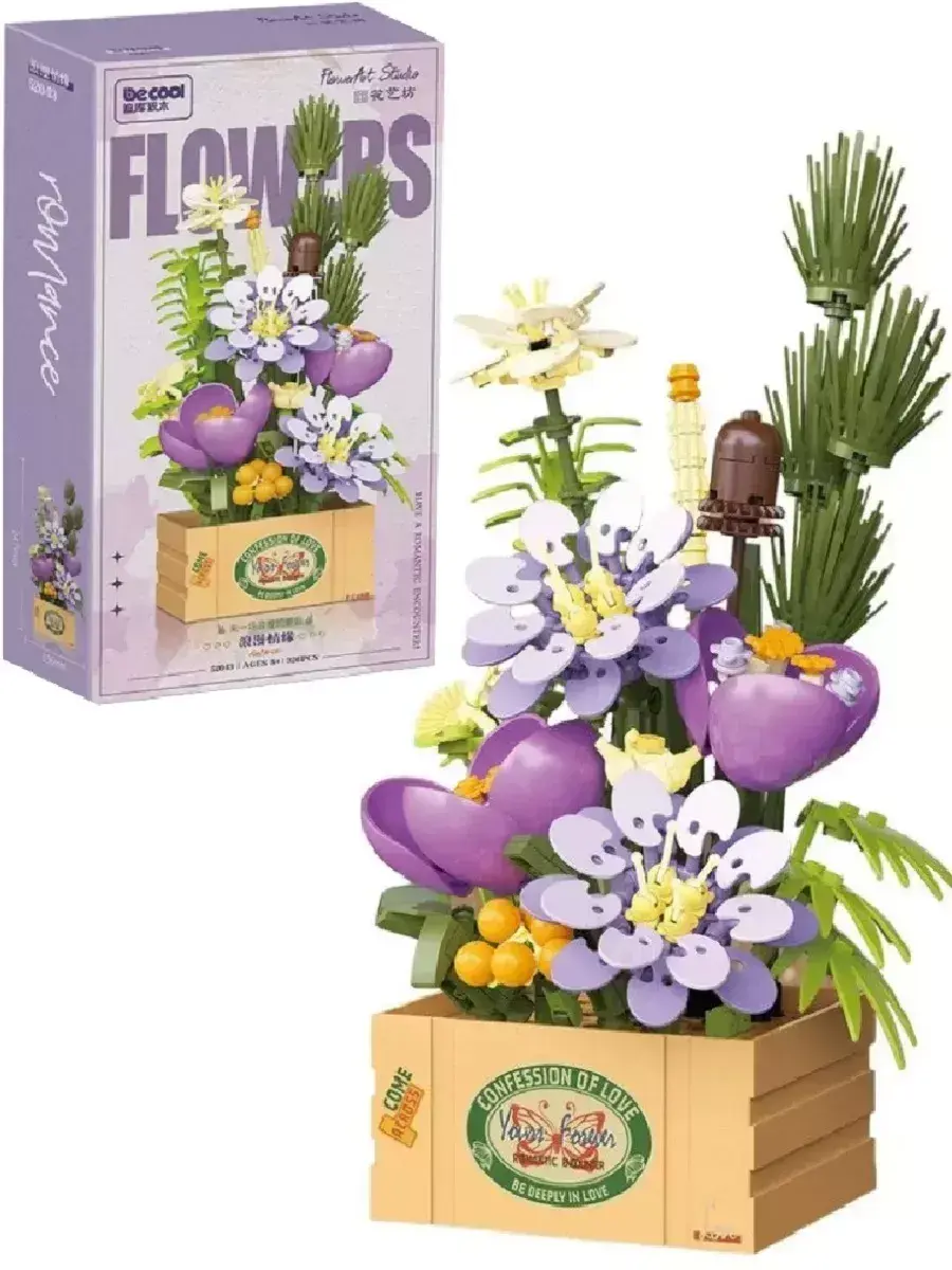 Создавайте свои уникальные композиции, экспериментируйте с размещением и сочетанием растений, чтобы получить неповторимый дизайн. Оригинальный букет впишется в любой интерьер. Набор цветов в ящичке способен украсить любой дом! Можно расположить собранный букет в гостиной, детской комнате или на рабочем месте. Цветочная композиция не только украсит пространство, но и будет притягивать к себе много внимания, вызывать восхищение глубиной и изяществом проработанных деталей! Конструктор Flowers подойдет в качестве подарка не только взрослым, но будет интересен детям и многим подросткам.