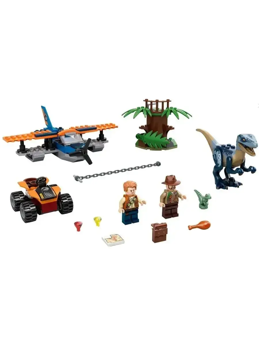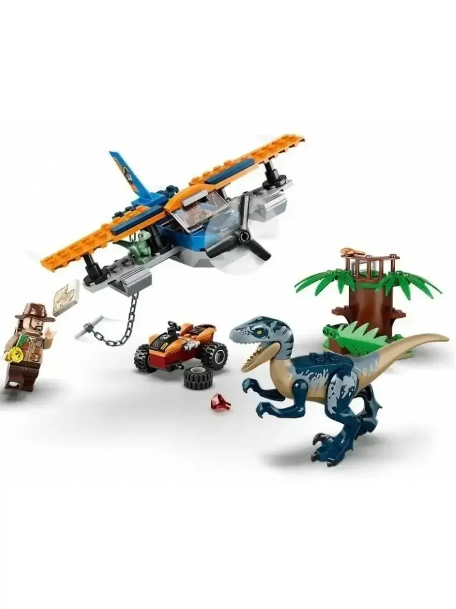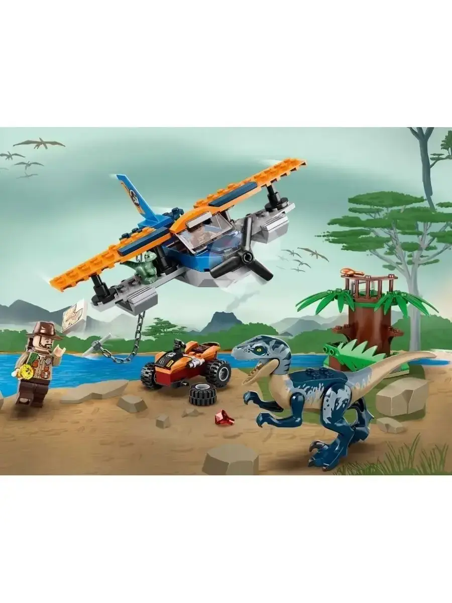 Играя с набором Велоцираптор: спасательная операция на биплане, маленький искатель приключений сможет представить себя в роли Оуэна Грэди, летящего на помощь Синджину Прескотту. Этот простой в сборке игрушечный биплан оснащен кабиной для мини фигурки и цепью для спасения Синджина. Этот набор также включает в себя подвижные фигурки велоцираптора и детеныша динозавра Дельты, наблюдательный пост на вершине дерева с гнездом динозавра, внедорожник, а также забавные аксессуары. В набор также входят подвижная фигурка велоцираптора, наблюдательный пост на вершине дерева, гнездо динозавра для детеныша велоцираптора Дельты, а также множество аксессуаров, таких как карта сокровищ, яйцо динозавра и два бриллианта для творческих игр. Размеры модели биплана — чуть более 6 см в высоту, 18 см в длину и 16 см в ширину.