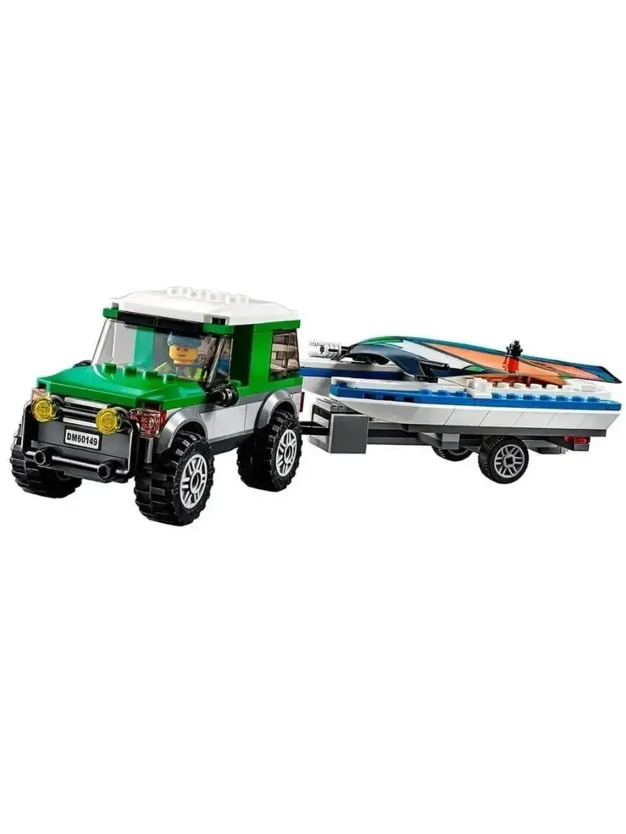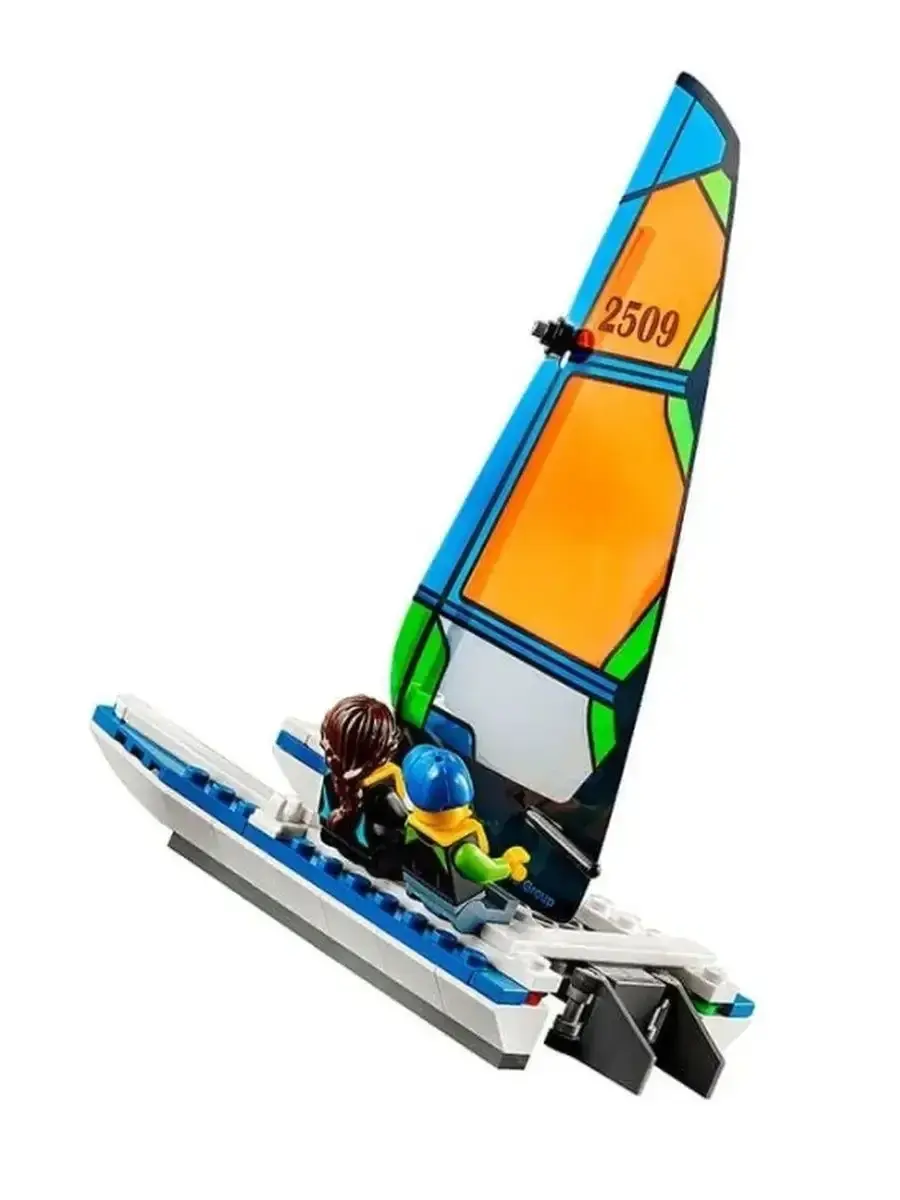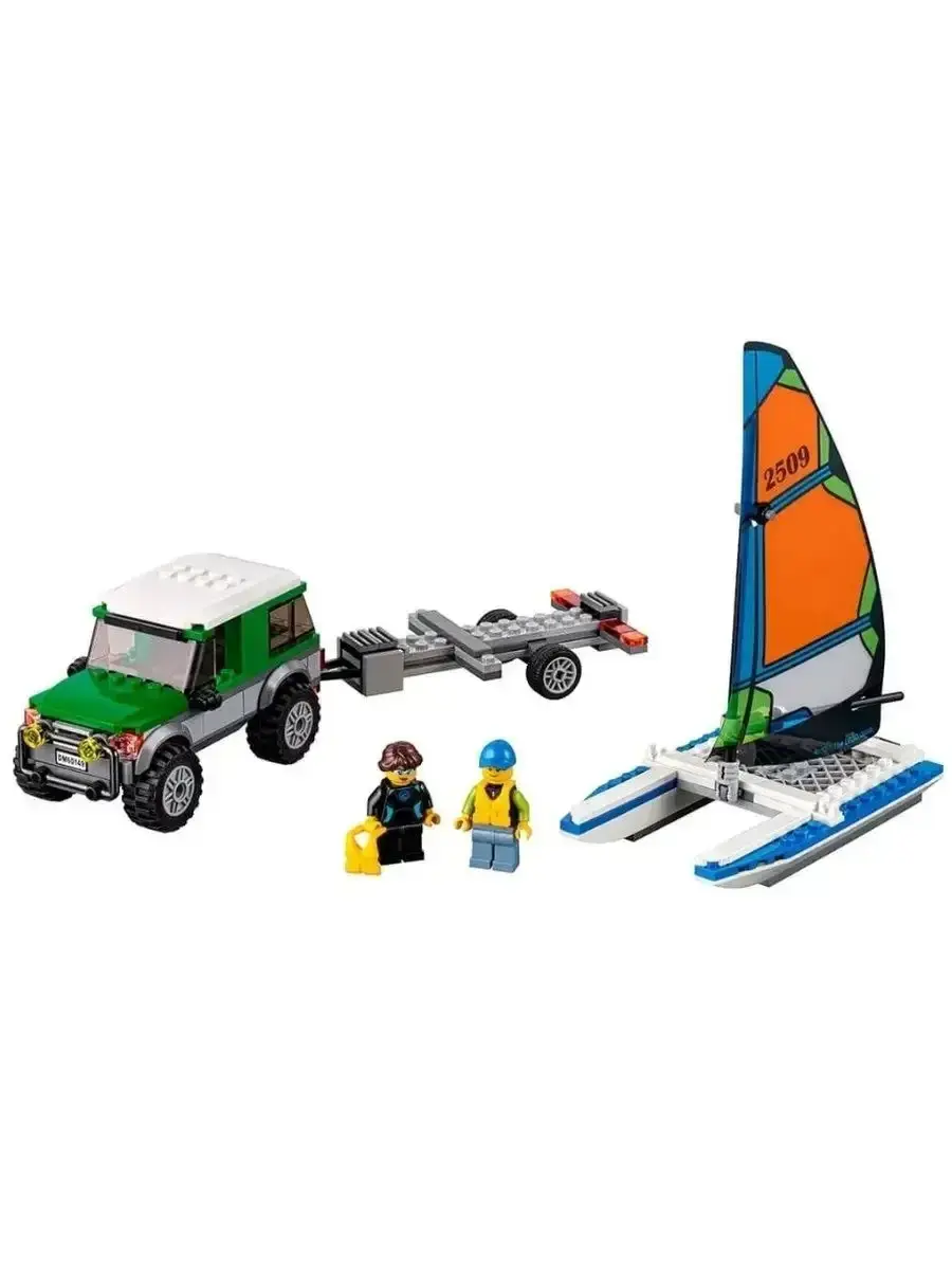 Конструктор Внедорожник с прицепом для катамарана – транспортное средство – перевозчик. Собранное из игрового набора, состоящего из 210 деталей, оно позволяет осуществлять транспортировку морских судов и принимать участие в захватывающих соревнованиях. Внедорожник – это черно-зеленый автомобиль с белой крышей, серыми, красными и желтыми вставками. На его переднем капоте располагается мощная система освещения в виде круглых фар. Прямо за ней находится защищенная закругленным ветровым стеклом кабина водителя конструктора City. Транспортировочная платформа крепится к заднему бамперу. Плоская и открытая она позволяет осуществлять транспортировку крупногабаритных грузов. Одним из таковых является сложенный катамаран. Занимаясь сборкой набора по образцу, юный мореплаватель сможет развить мелкую моторику рук, память, внимание, пространственно-логическое мышление. Игра с конструктором позволит раскрыть ребенку творческие способности.