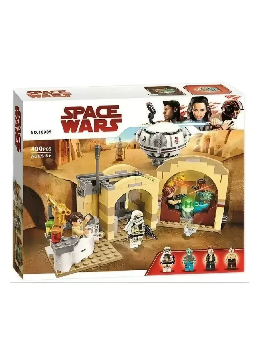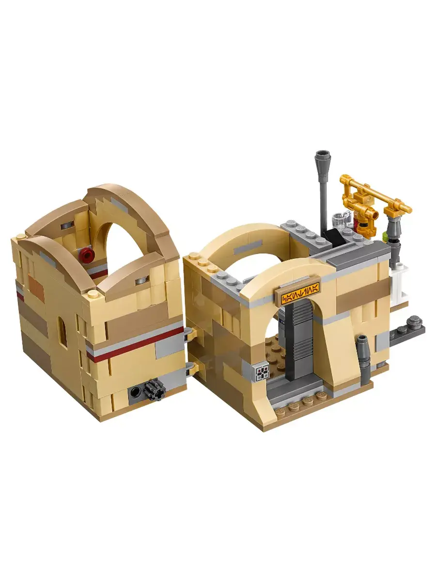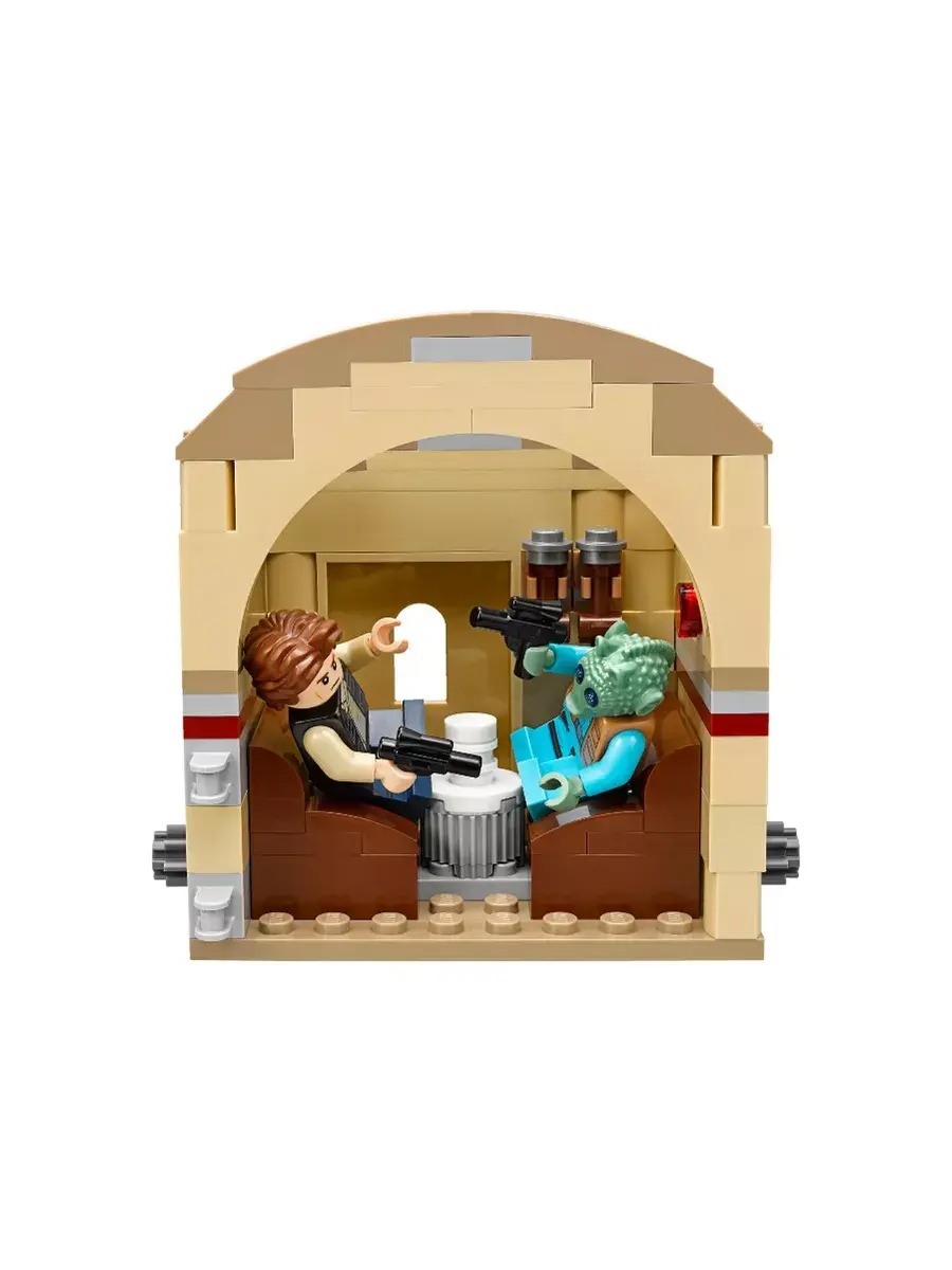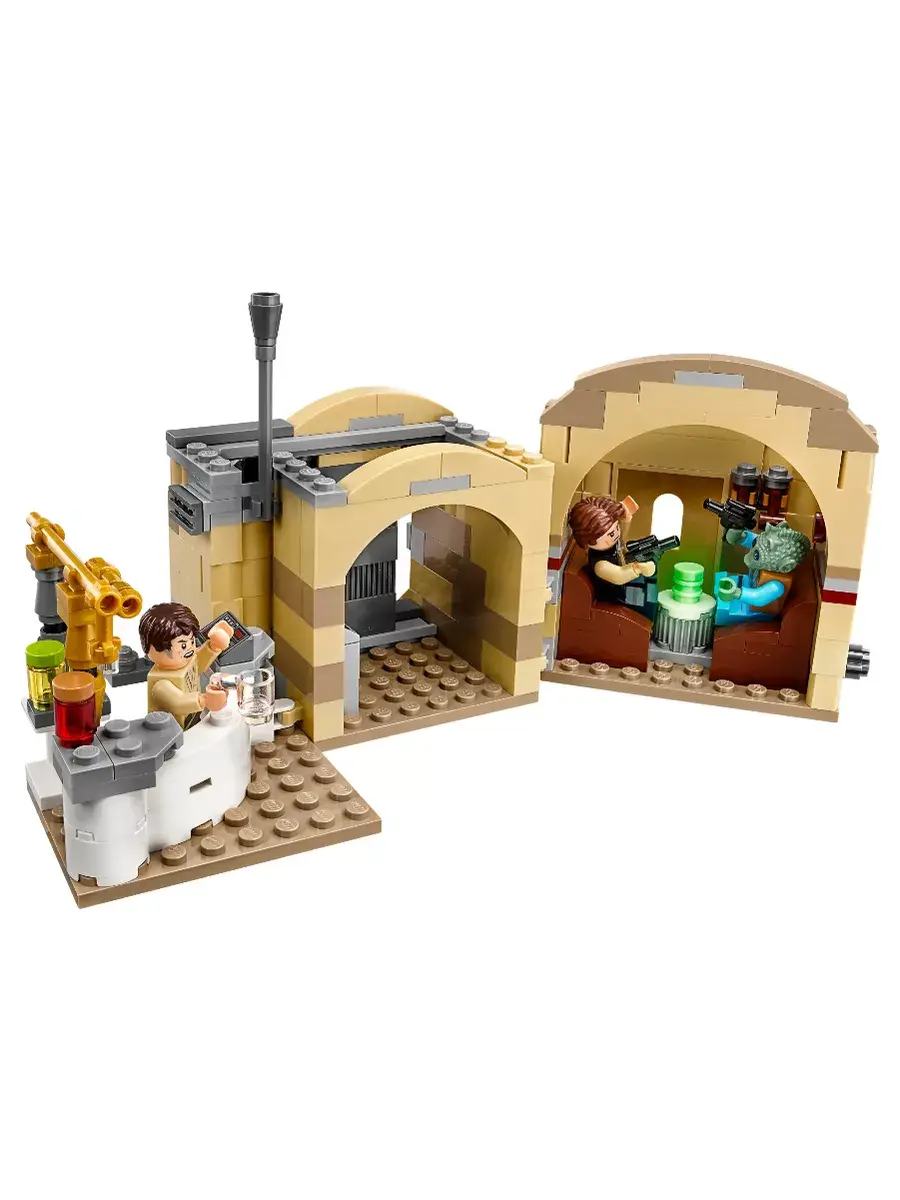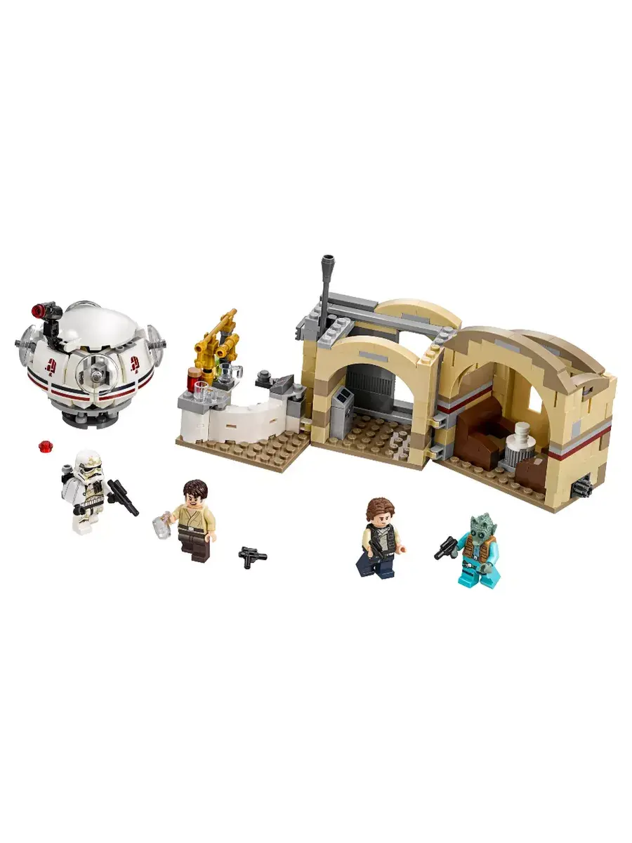 Конструктор таверня Кантина Мос-Эйсли. Комплект позволяет разнообразить свою коллекцию звездолетов из знаменитого фильма с помощью сборки здания увеселительного заведения с купольной крышей и барной стойкой, кассовым аппаратом и автоматом для смешивания коктейлей внутри. В набор вошли мини фигурки Хана Соло, песчаного штурмовика, Гридо и Вухера.